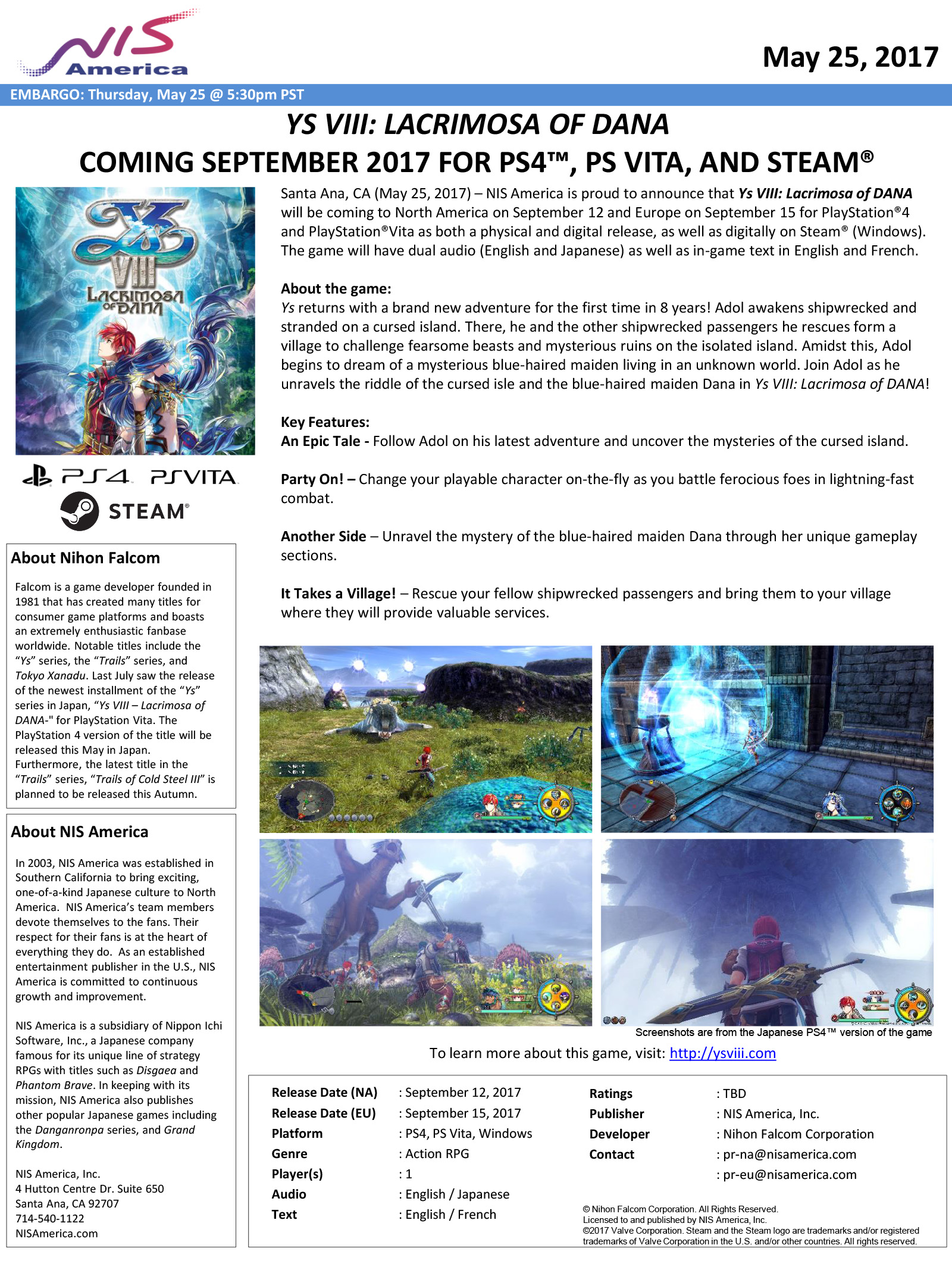 The publisher has announced that the new YS, called Lacrimosa of Dana, will launch on September 12 in North America, followed by a European release on September 15 on PlayStation 4, PlayStation Vita, and PC. Sony’s platforms will also get a physical release, while the PC will have to make do with a Steam-only digital edition. Japanese/English voice overs can be used with English/French subtitles, so if you like to play games in their original language with English subs, you have nothing to fear.